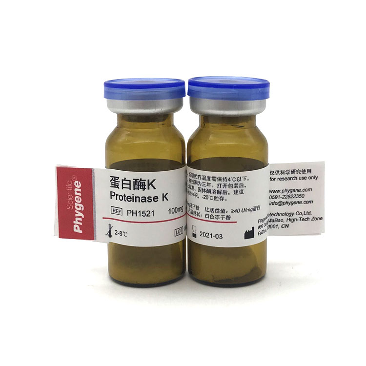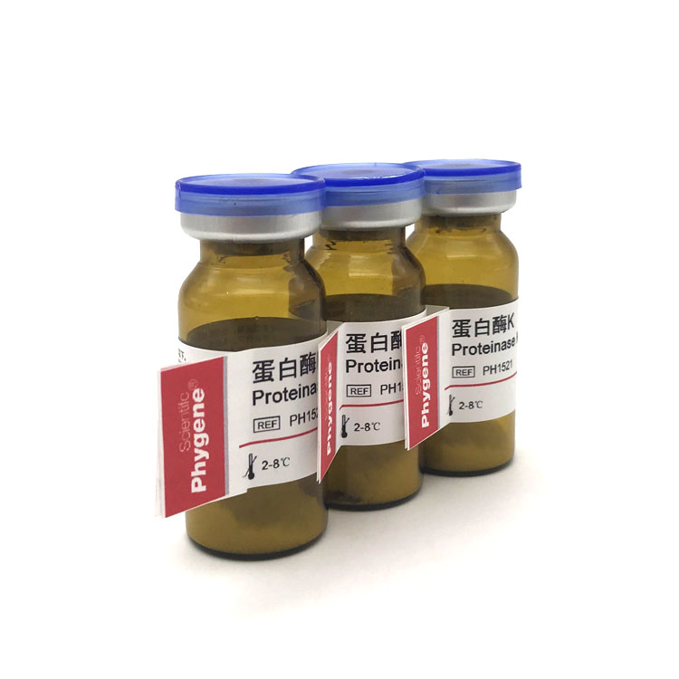 Proteinase K exhibits broad substrate specificity. It degrades many proteins in the native state even in the presence of detergents. Proteinase K is isolated from a fungus, Beauveria brongniartii which is able to grow on keratin. The predominant site of cleavage is the peptide bond adjacent to the carboxyl group of aliphatic and aromatic amino acids with blocked alpha amino groups. Proteinase K is a stable and highly reactive serine protease. It is stable in a broad range of environments: pH (4 to 12.5), buffer salts, detergents (0.1-0.5% SDS) and temperature (0 to75℃).Proteinase K is commonly used in molecular biology to digest protein and remove contamination from preparations of nucleic acid. It is also used in leather industry (leather softening, leather refinement, leather depilation and silk degumming), food industry (meat tenderization and wine clarification) and detergent industry. It is highly suited to this application since the enzyme is active in the presence of chemicals that denature proteins, such as SDS and urea, chelating agents such as EDTA, sulfhydryl reagents, as well as trypsin or chymotrypsin inhibitors. Proteinase K is used for the destruction of proteins in cell lysates (tissue, cell culture cells) and for the release of nucleic acids, since it very effectively inactivates DNases and RNases.