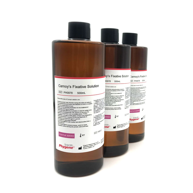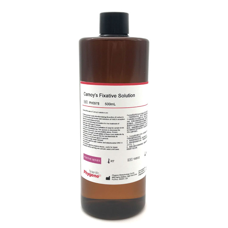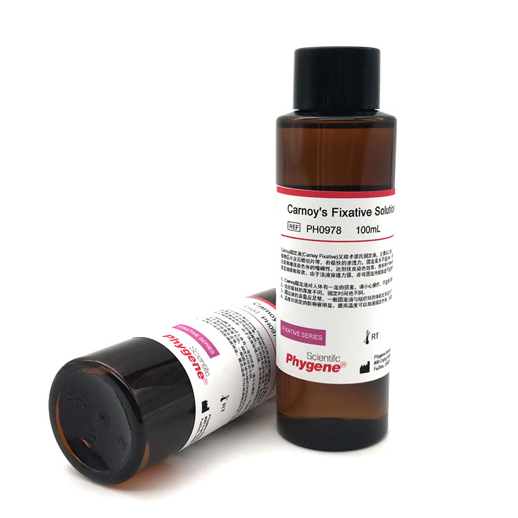 Phygene Carnoy固定液(Carnoy Fixative)又称卡诺氏固定液,主要由乙醇、乙酸等混合而成。适用于一般动物组织和细胞的固定,常用于动植物压片及石蜡切片等,有极快的渗透力,固定最多不超24h。其特点是能迅速穿透细胞,将其固定并维持染色体结构的完整性,还能够增强染色体的嗜碱性,达到优良染色效果。推荐用于RNA和DNA染色的组织固定,亦用于糖原染色的组织固定,能够使糖原呈细微颗粒状。由于该液穿透力强,亦可固定外膜致密不宜渗透的组织。组织固定后暂时不用,可置于70%乙醇中保存。