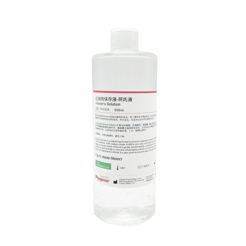 阿氏液又称为Alsever液或红细胞保存液,是一种等渗平衡盐溶液。Alsever液可以保护红细胞,通常用作抗凝剂或血液防腐剂,用于采血、保存和运送含有红细胞的血液。 Phygene的 Alsever Solution主要由柠檬酸、柠檬酸钠、葡萄糖、氯化钠等组成,pH值为5.9~6.3,其中柠檬酸钠起到抗凝作用,葡萄糖为细胞提供营养。允许全血在冷藏温度下储存2个月而不改变红细胞的活性,该溶液经过滤除菌处理,1~4:1稀释后使用。