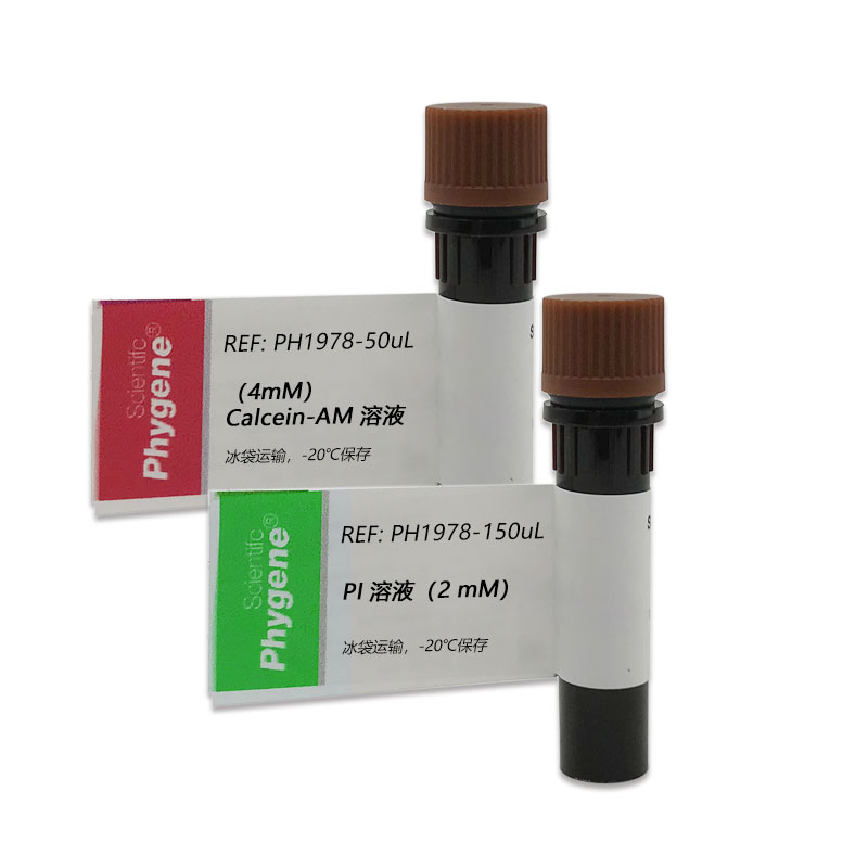 Calcein AM (中文名称为钙黄绿素 AM 或钙黄绿素乙酰氧基甲酯)和碘化丙啶 (PI) 溶液,分别对活细胞和死细胞染色,可用于同时对活细胞和死细胞进行荧光染色。