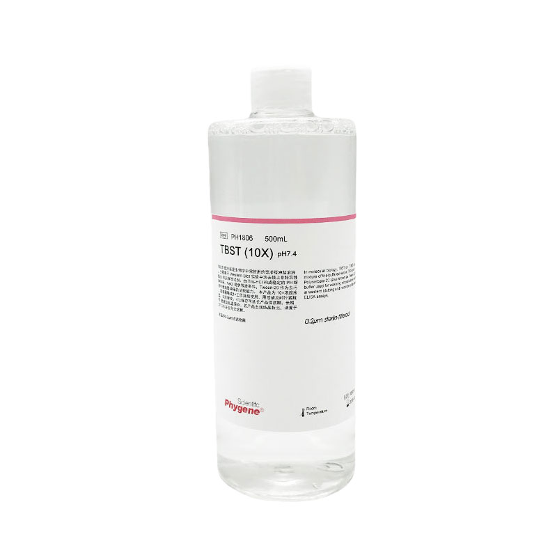 TBST 缓冲液是生物学中常使用的等渗缓冲盐溶液,主要用于 Western Blot 实验中洗去膜上非特异性结合 的抗体等试剂。由 Tris-HCl 构成稳定的 PH 缓冲体系,NaCl 提供等渗条件,Tween-20 作为去污剂可增加缓冲液的洗脱能力。 本产品为 10×浓缩液,需要稀释成1×工作液后使用,用后请及时拧紧瓶盖,以防挥发。4℃保存可延长产品保质期,长期不 用建议低温保存。若产品出现结晶析出,请置于 37℃水浴至完全溶解。
