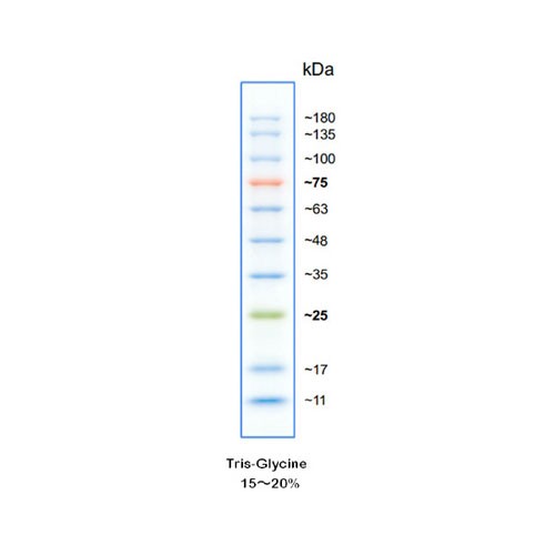 本产品包含10种彩色预染的已知分子量标准蛋白,分子量范围为11kD-180kD,每种蛋白含量约为0.2-0.4mg/ml。预染marker可以用于直接观察蛋白质电泳状况以及清晰地判断Western Blot的转膜效果。经SDS-PAGE凝胶电泳或转移到PVDF或NC膜上可得到清晰的10条彩色蛋白条带,其中25kD为绿色条带,75kD为红色条带,其余8条是蓝色条带。