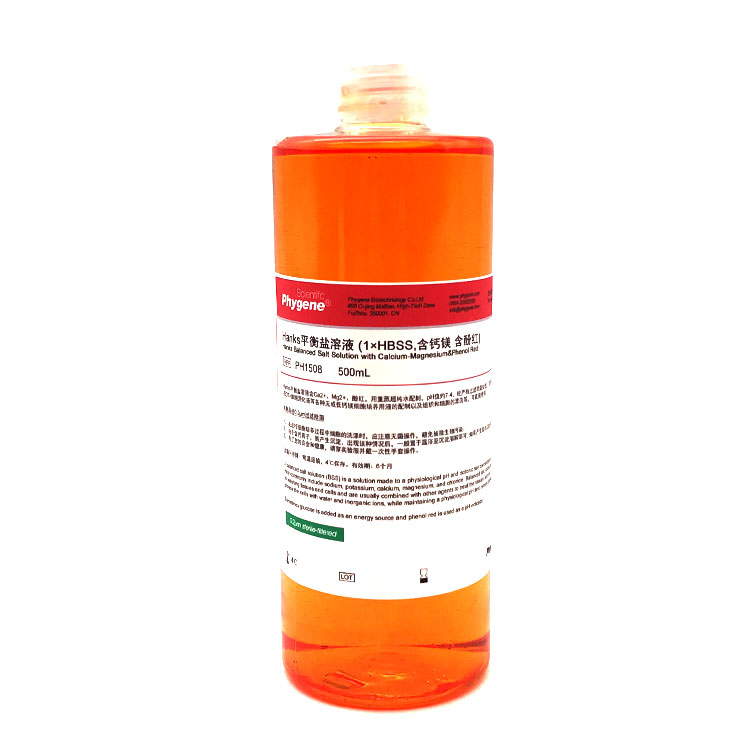 常见的平衡盐溶液有Eargle液、Hanks液、磷酸盐缓冲溶液(PBS)等。Hanks平衡盐溶液是最常用的磷酸盐缓冲溶液之一,又称Hanks' Balanced Salt Solution、Hanks’BSS, 或HBSS, 主要由氯化钠、氯化钾、磷酸盐、碳酸氢钠、葡萄糖等组成,含Ca2+、Mg2+、酚红,pH值一般为7.2~7.4。Hanks平衡盐溶液(1×,含酚红),含Ca2+、Mg2+、酚红,用重蒸超纯水配制,pH值7.4,经0.2um过滤处理,可用于胰蛋白酶-EDTA细胞消化液等各种无或低钙镁细胞培养用液的配制以及组织和细胞的漂洗等,直接使用。