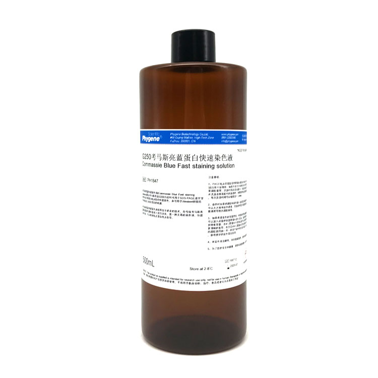 | 产品名称 : | PH1847 | G250考马斯蛋白快速染色液 Commassie Blue Fast staining solution |