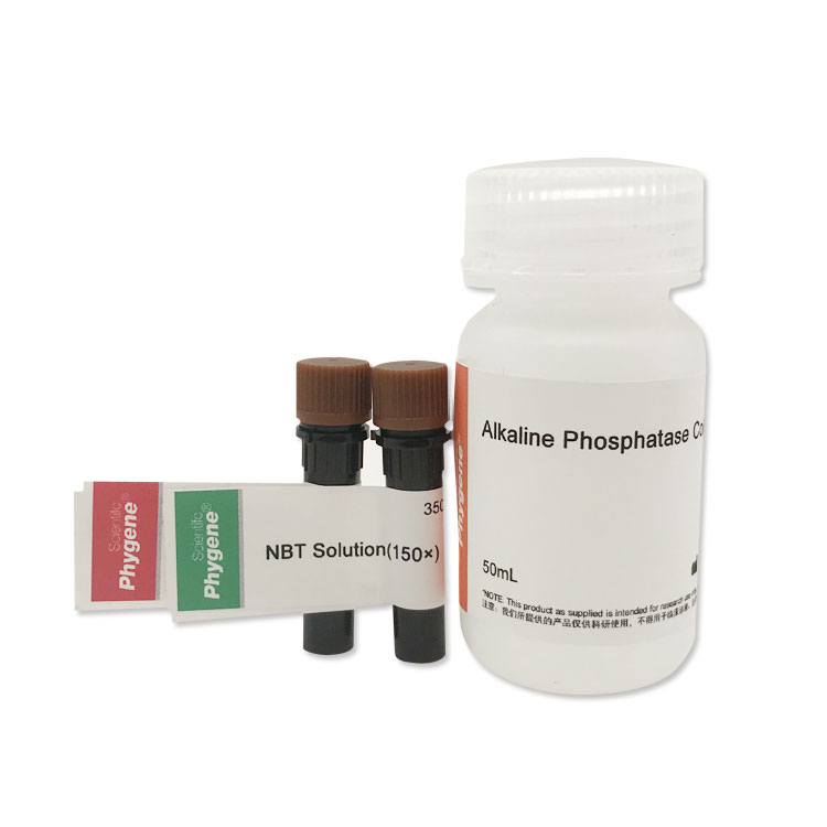 BCIP/NBT 碱性磷酸酯酶显色试剂盒(BCIP/NBTAlkaline Phosphatase Color Development Kit)是一种用于免疫组化显色、Western 等膜显色和诱导多功能干细胞 iPS 鉴定等的试剂盒。BCIP/NBT 是碱性磷酸酯酶的常用底物,在碱性磷酸酯酶的催化下,BCIP 会被水解产生强反应性的产物,该产物会和 NBT 发生反应,形成不溶性的深蓝色至蓝紫色的 NBT-formazan。