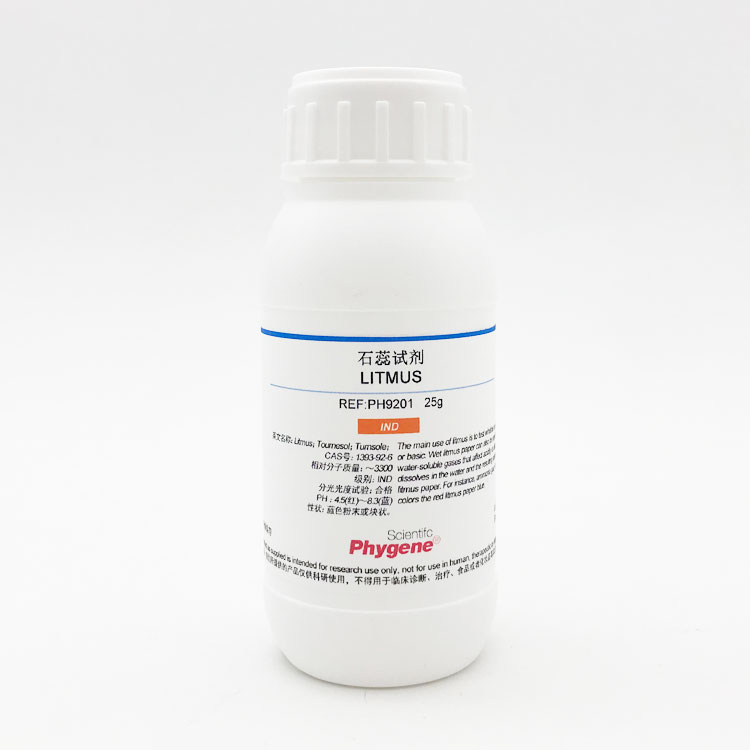 石蕊(Litmus)的性状为蓝紫色粉末,是从地衣植物中提取得到的蓝色色素,能部分地溶于水而显紫色。是一种常用的酸碱指示剂,变色范围是pH=4.5-8.3之间。是一种弱的有机酸,在酸碱溶液的不同作用下,发生共轭结构的改变而变色。