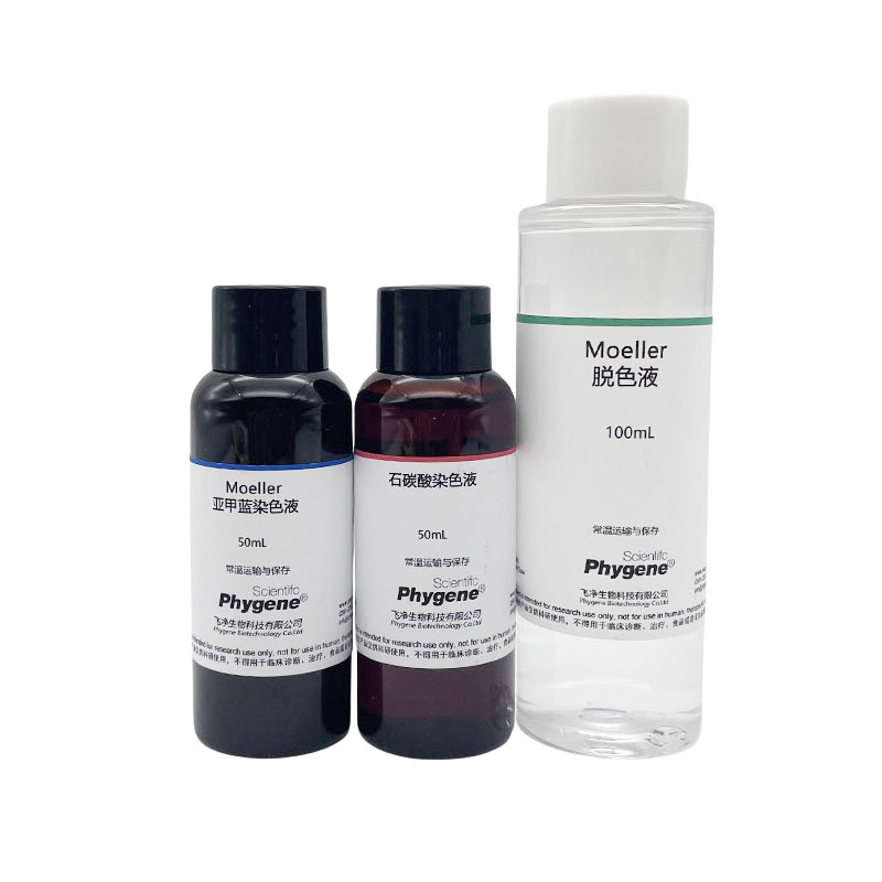 芽孢染色液(Moeller 法)主要由石炭酸染色液、Moeller 亚甲蓝染色液、Moeller 脱色液组成,芽孢会被染成红色,菌体呈红色,操作简单,结果判断更可靠。但应注意,观察芽孢应在成熟期,但也不能过久,否则只能看到芽孢,而营养体已经消失。该染色液仅用于科研领域,不用于临床诊断或治疗。