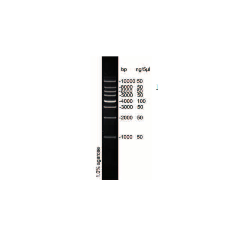 1000,2000,3000, 4000, 5000,6000,8000,10000bp。其中4000bp条带浓度为100ng/5μl,显示为加亮带,其余条带浓度为50ng/5μl。