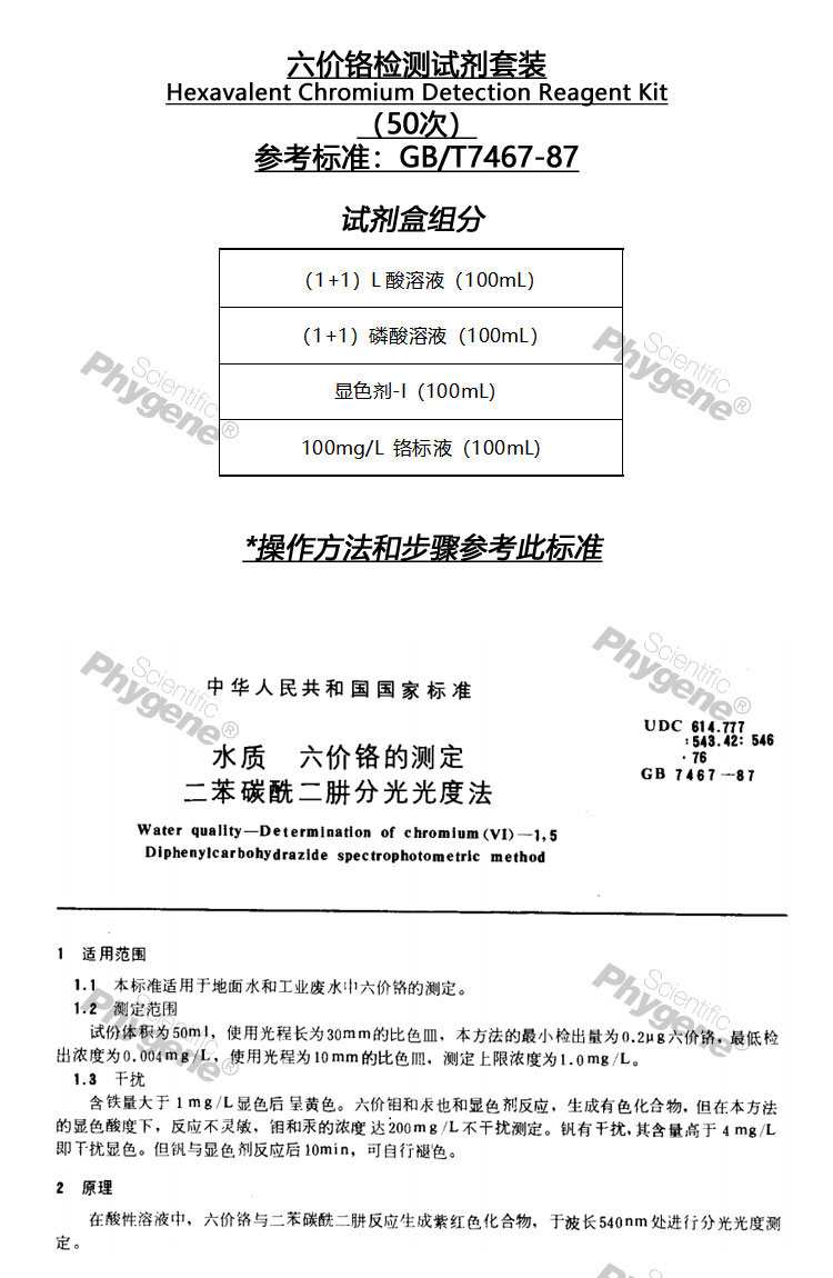 | 产品名称 : | PLM019 | 六价铬检测试剂套装 Hexavalent Chromium Detection Reagent Kit(50次) 参考标准:GB7467-87 |